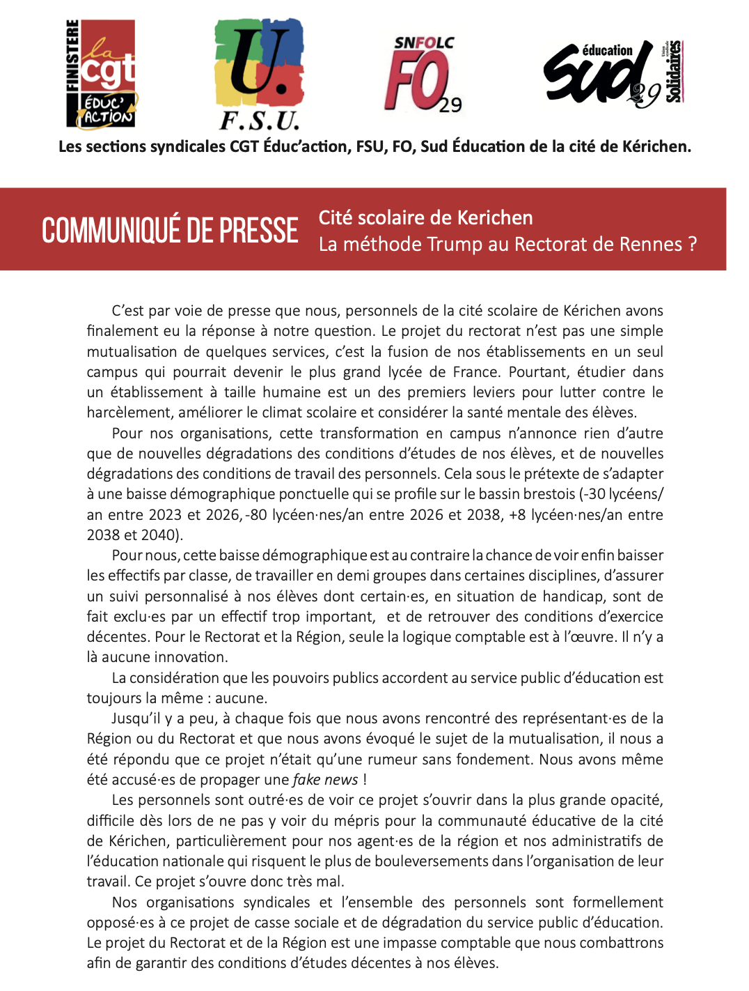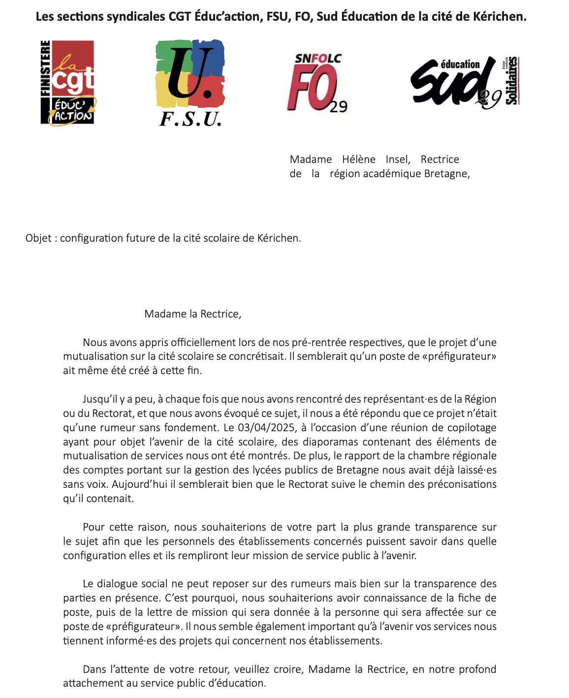 Vous êtes ici : Accueil Sections départementales SNES 29 Brest - Kerichen : bientôt le plus grand lycée de France ? 17 octobre 2025 Sections départementales Brest - Kerichen : bientôt le plus grand lycée de France ? Imprimer l'article Communiqué de Presse : Courrier à Mme Insel :