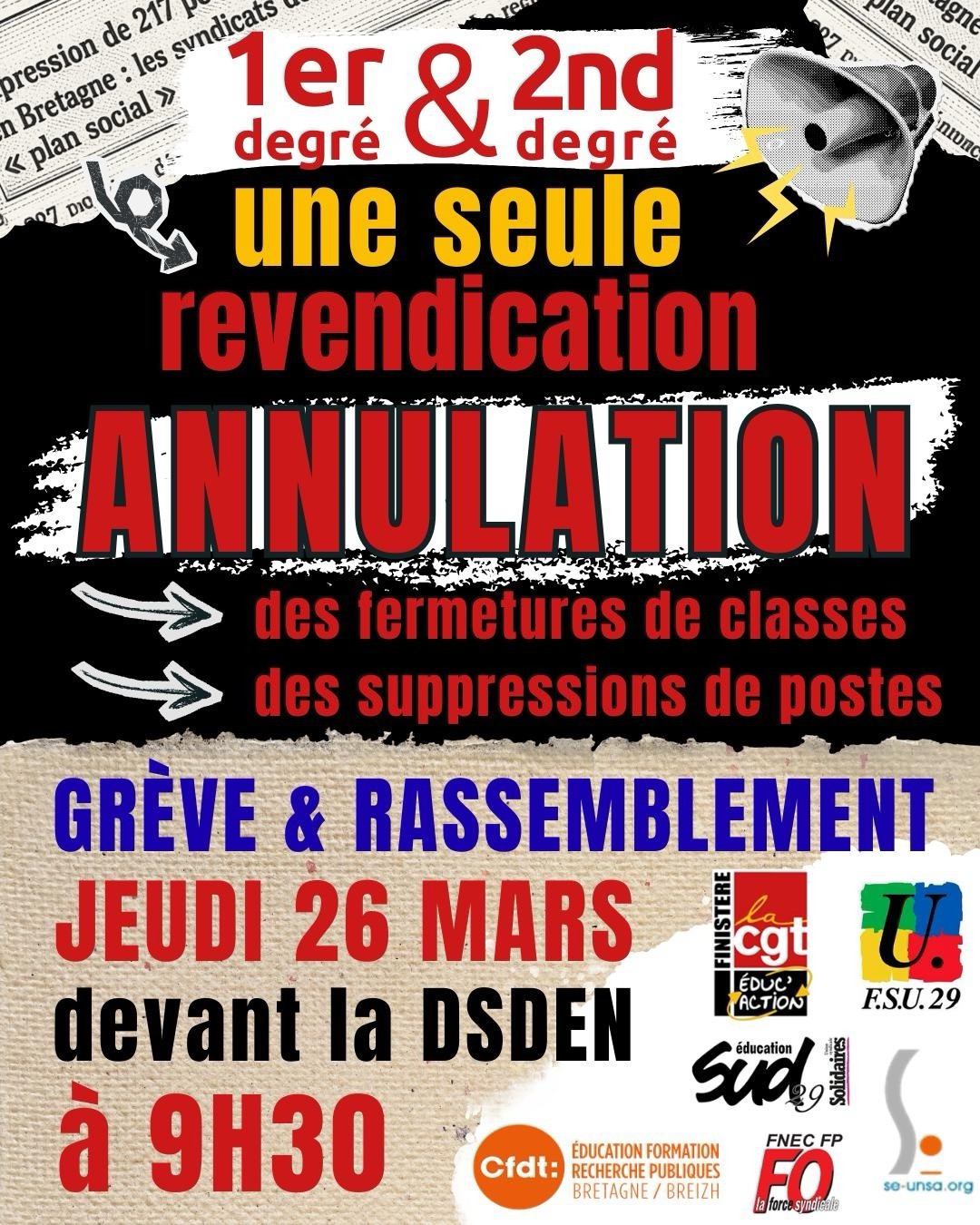 jeudi 26 mars dès 9h30 devant la DSDEN à Quimper pendant le Conseil Spécial