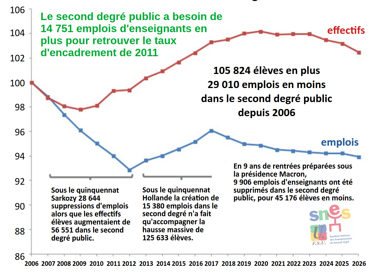 Dans l’immédiat, la rentrée se prépare avec 2245 élèves de moins dans le réseau public (1306 dans le privé) dont -2123 en collège. Le Rectorat a donc fait le choix de supprimer massivement des emplois dans les collèges : -181 ETP sont prélevés, au-delà de la perte de 131 dans le budget académique. En effet, des postes sont créés en ULIS, en UPE2A, en SEGPA et dans les LP. Les lycées regagnent 4 emplois après en avoir perdu 164 sur deux ans, sans réelle baisse d’effectifs, pour financer le « choc des savoirs » en collège.