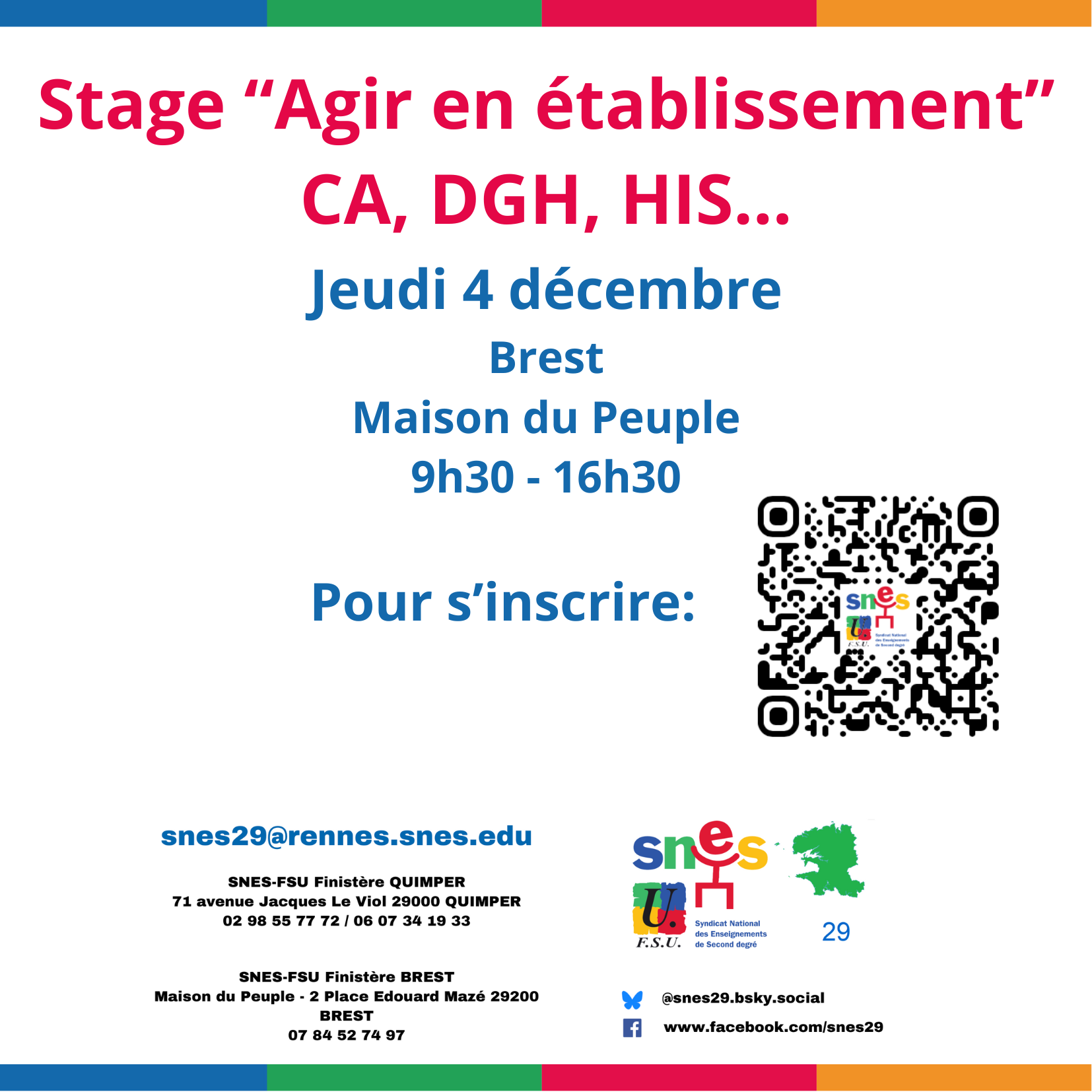 Les militant.es du SNES-FSU 29 organisent un stage « Agir en établissement » le jeudi 4 décembre 2025, à la maison du Peuple de Brest à partir de 9h30.
